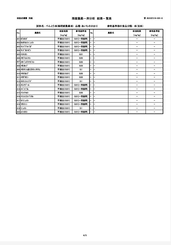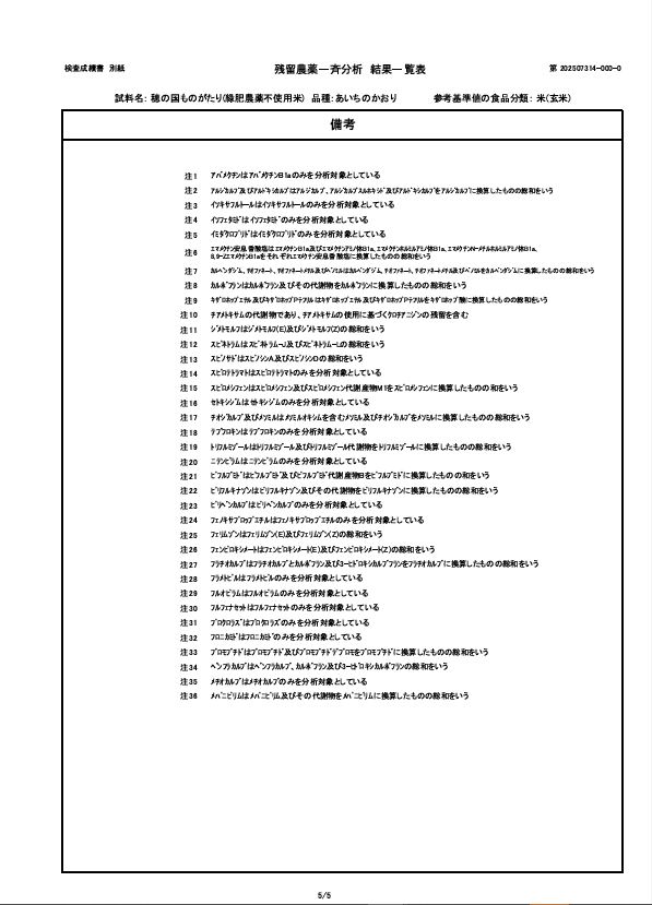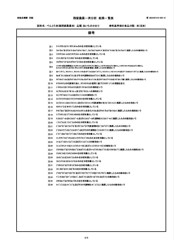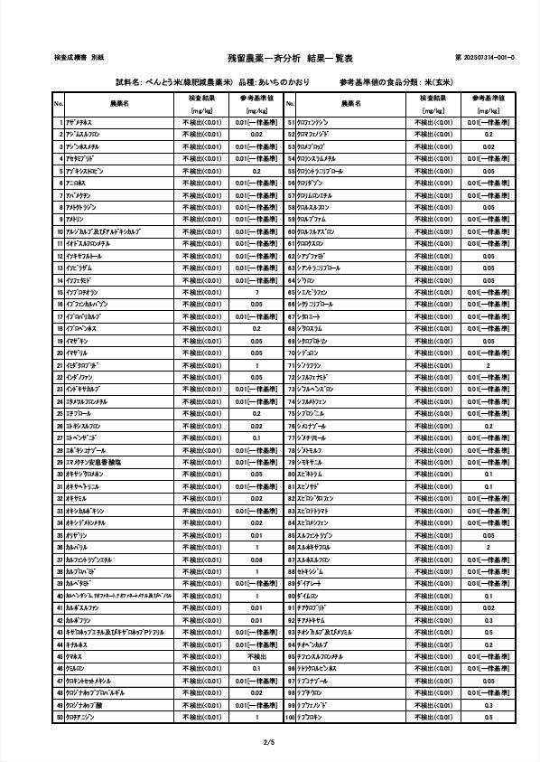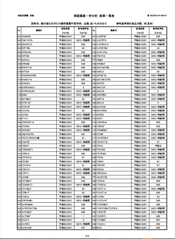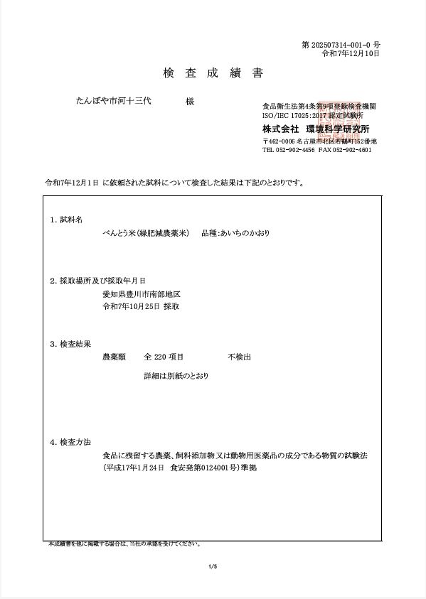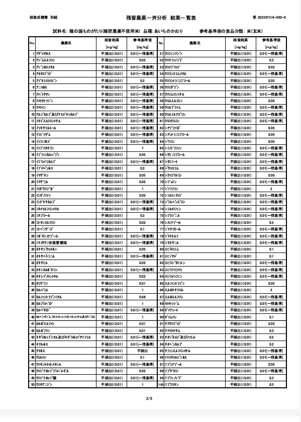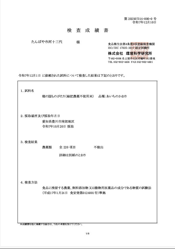 2026.01.03 報告:令和7年度産 残留農薬検査の結果について 令和7年度産の残留農薬検査の結果について報告いたします。当家では毎年第三者機関にて玄米の残留農薬検査を行い、品質の担保に努めています。今年は ①『 穂の国ものがたり 』緑肥栽培・農薬不使用米 及び②『べんとう米』緑肥栽培・農薬(初期除草剤)1回使用の2つの商品について検査いたしました。結果はどちらとも『農薬類 全220項目 不検出』 でした。 以下、①『穂の国ものがたり 』 検査成績表 以下、②『べんとう米』検査成績表